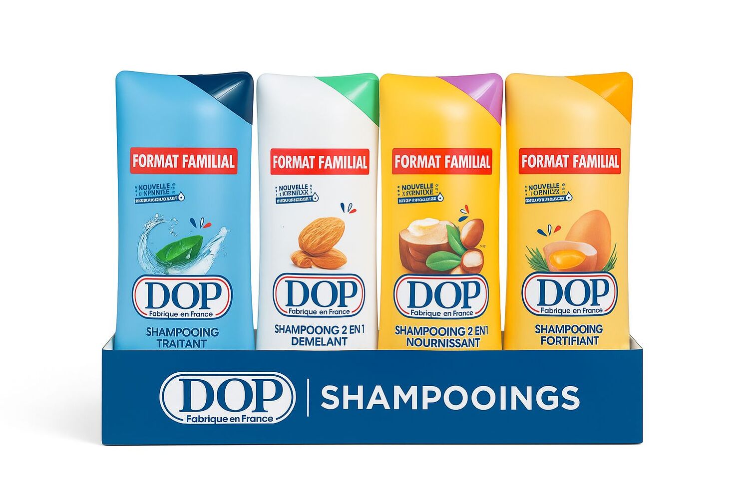 C2415 SHAMPOOINGS DOP – DISPLAY MULTI-RÉFÉRENCES 500 ML : ANTIPELLICULAIRE X3, AMANDE DOUCE X5, KARITÉ X3, AUX ŒUFS X5 (16 PIÈCES)