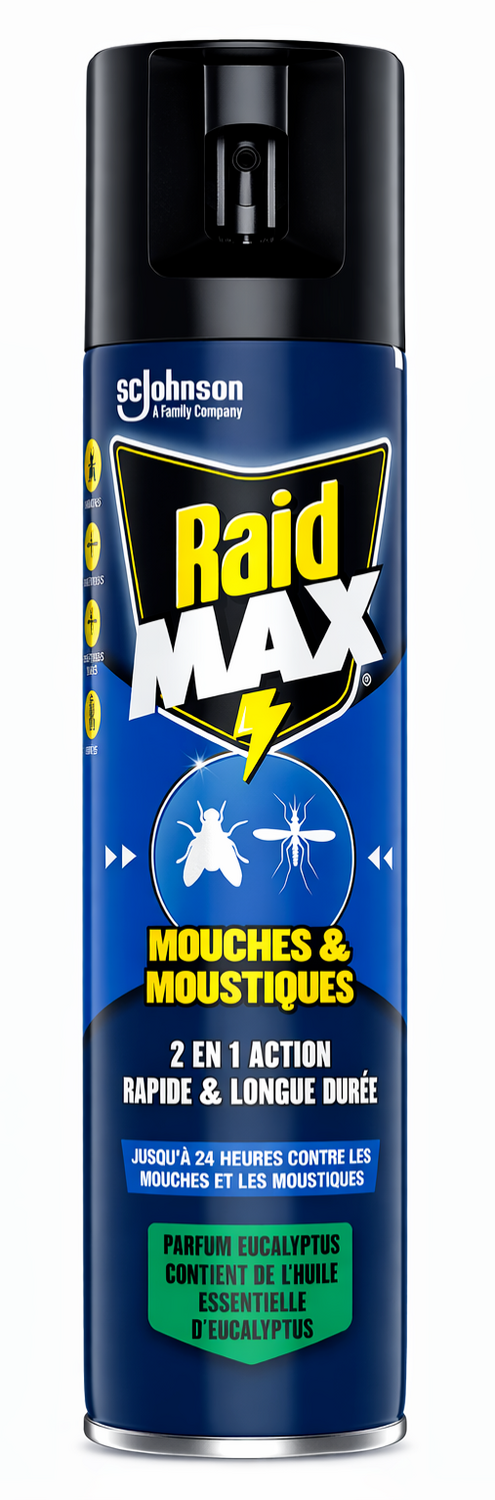 C2500 RAID MAX AÉROSOL MOUCHES ET MOUSTIQUES 2 EN 1 ACTION RAPIDE ET LONGUE DURÉE PARFUM EUCALYPTUS